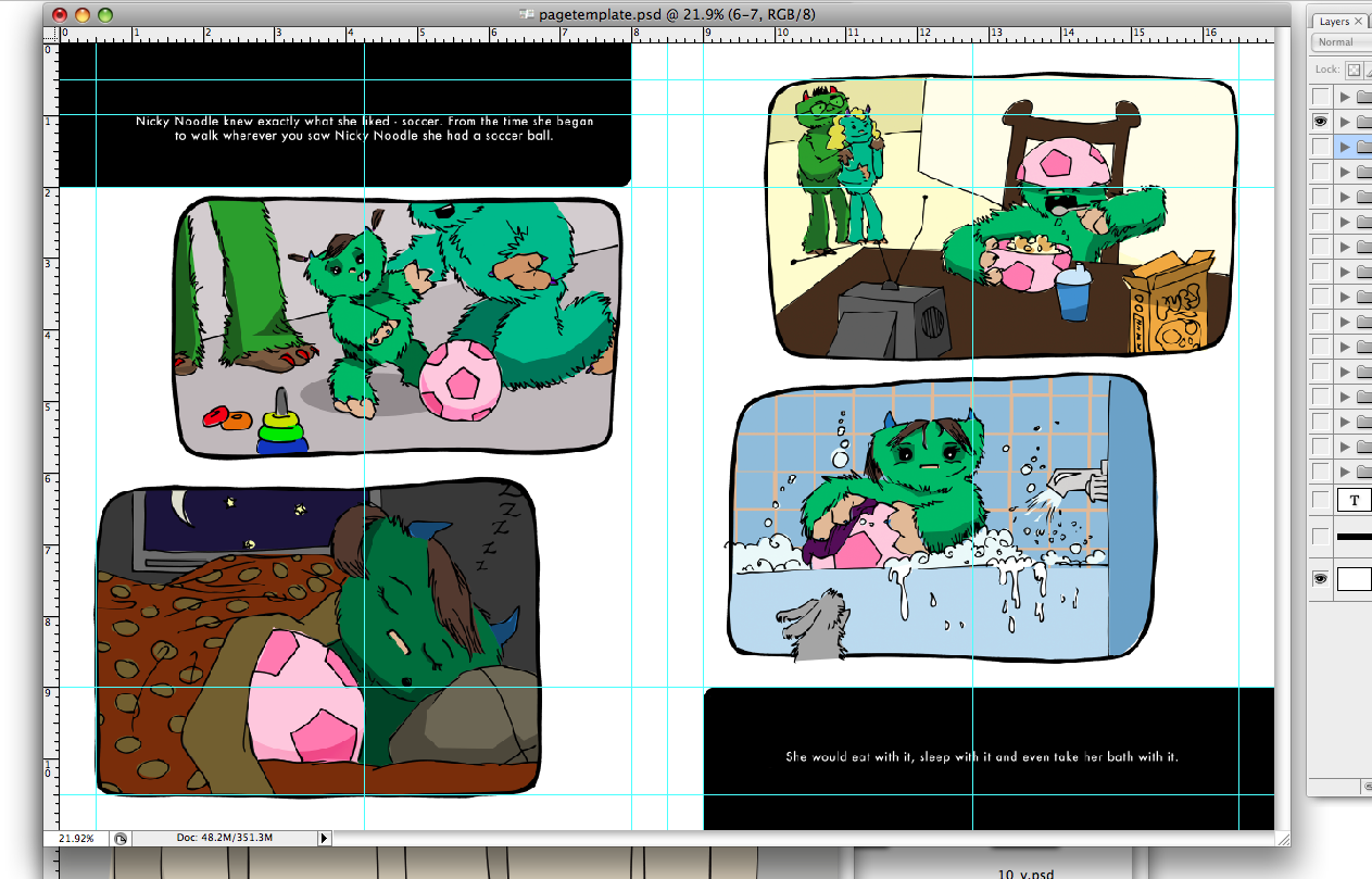 Decided to go with 8.5x11” [book options]. It will be the easiest to set up. Time to get into Photoshop and get text in place now that most of the illustration ideas are finalized. Instead of going the traditional children’s book route with keeping white space in the illustrations and placing text there, I want to go with a more contemporary look. Almost more of a magazine look with solid blocks of color on the top and bottom of the pages. I don’t recall seeing this in any book I read as a kid, but I’ll give it a whirl. The trick will be to not have the contrast so strong that the text and illustrations become two separate elements.