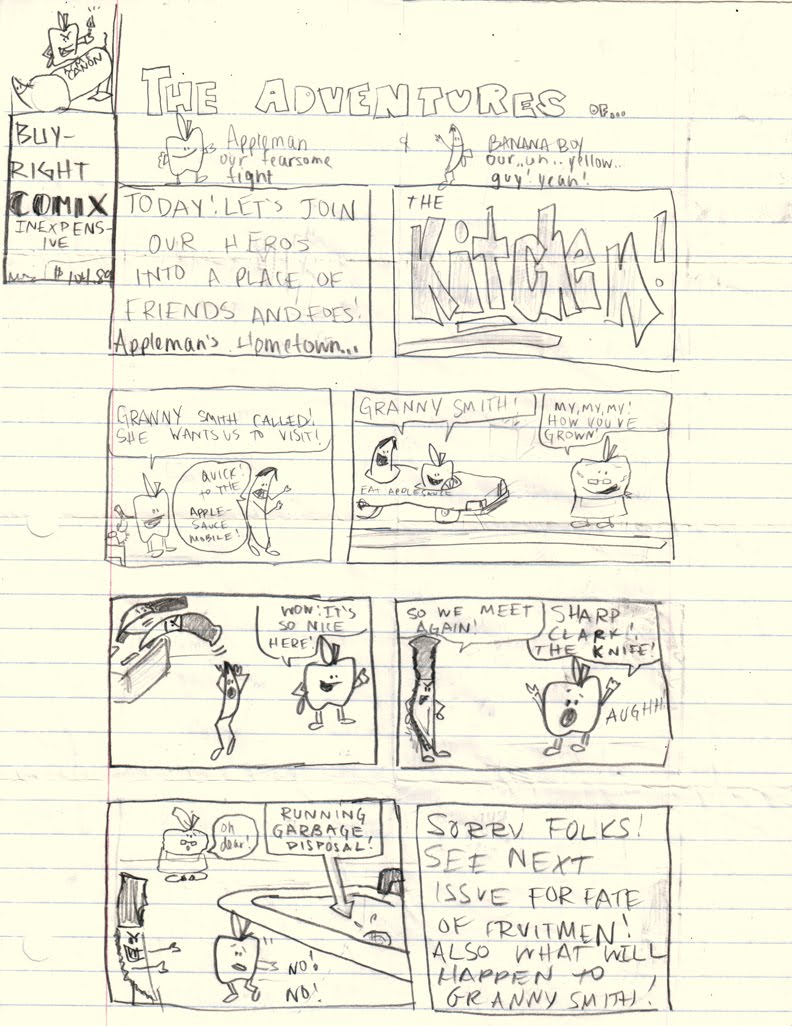(BEWARE: there's some English youngens out there on Youtube who refer to their antics as The Adventures of Appleman and Banana Boy as well. I think I win this one though, since most of these comics were done before those lads were even born... =sigh= But I feel confident enough to post these now because I've separated my sophisticated, highly evolved 28-year old self from my former, nerderific pencil-wielding 13-year old one.)